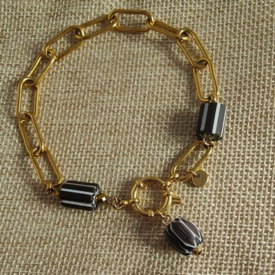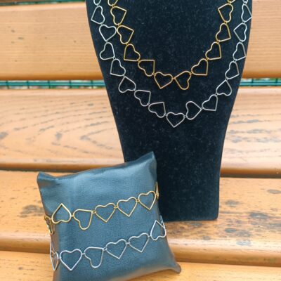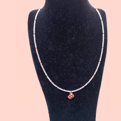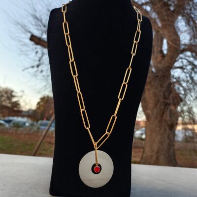 • Parure 2 Pièces AMINA Un bijou fait main associant chaînes en mailles Trombones dorées, un pendentif disque en acier argenté et une breloque en strass de cristal rouge. Parfait pour toutes les occasions, apportant élégance et prestige.