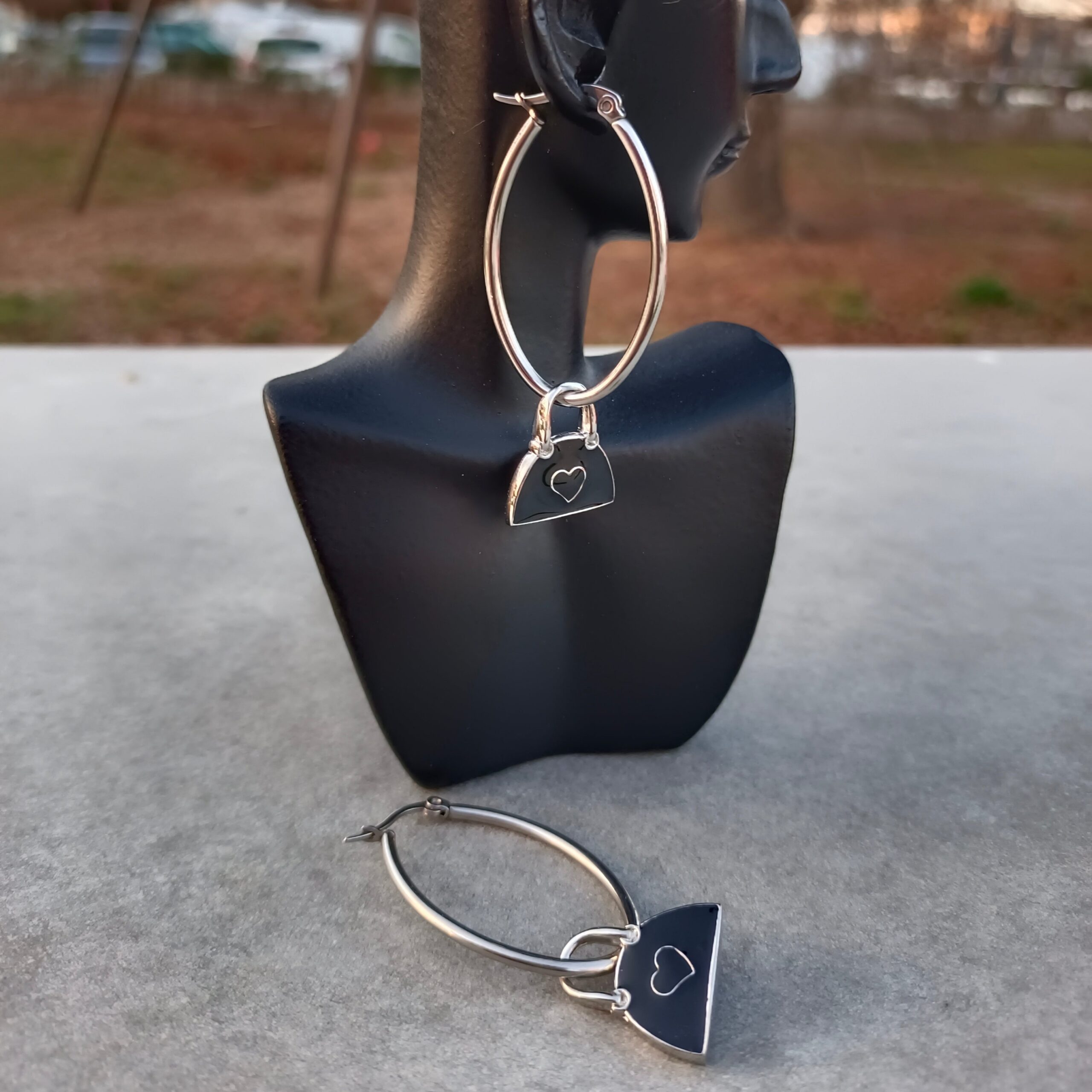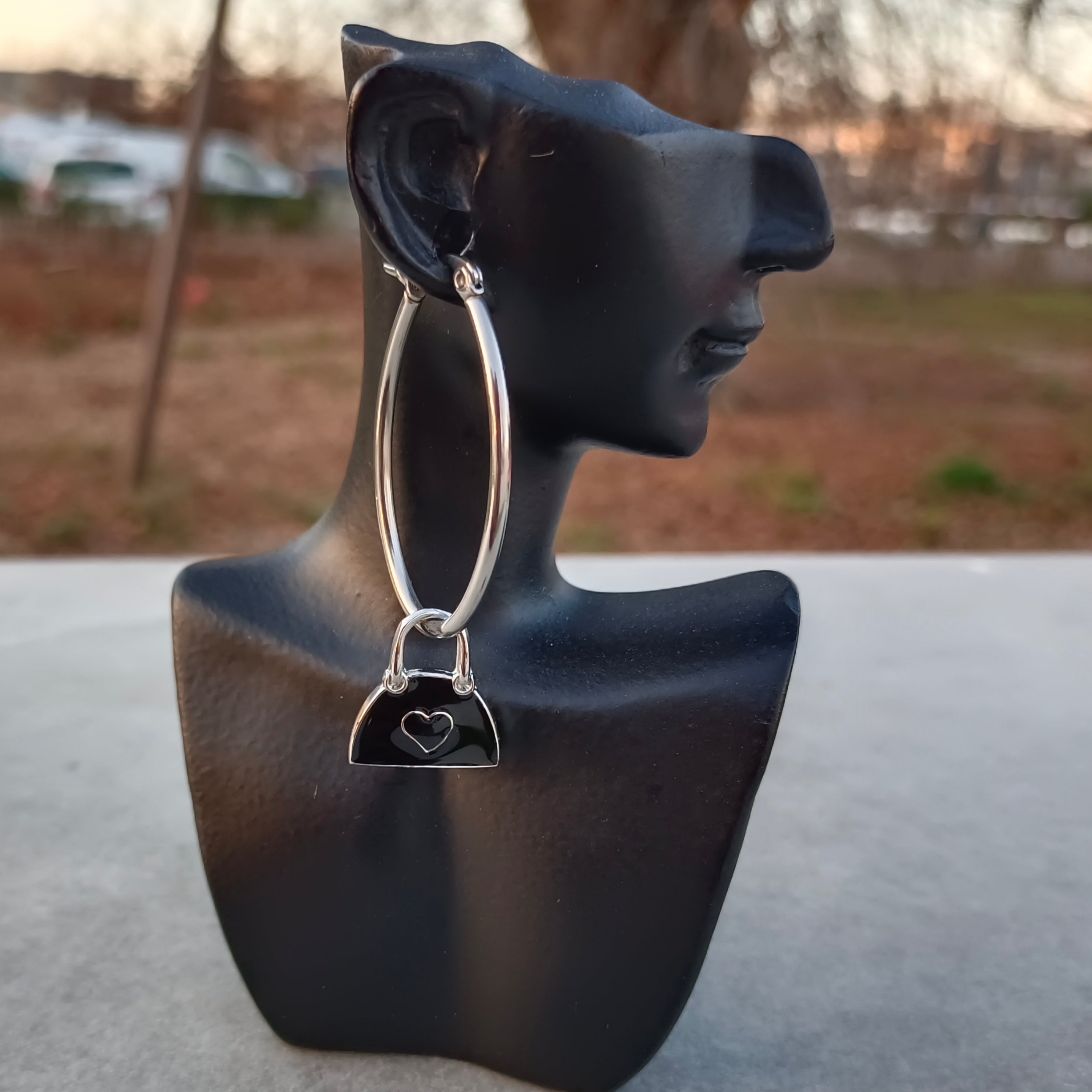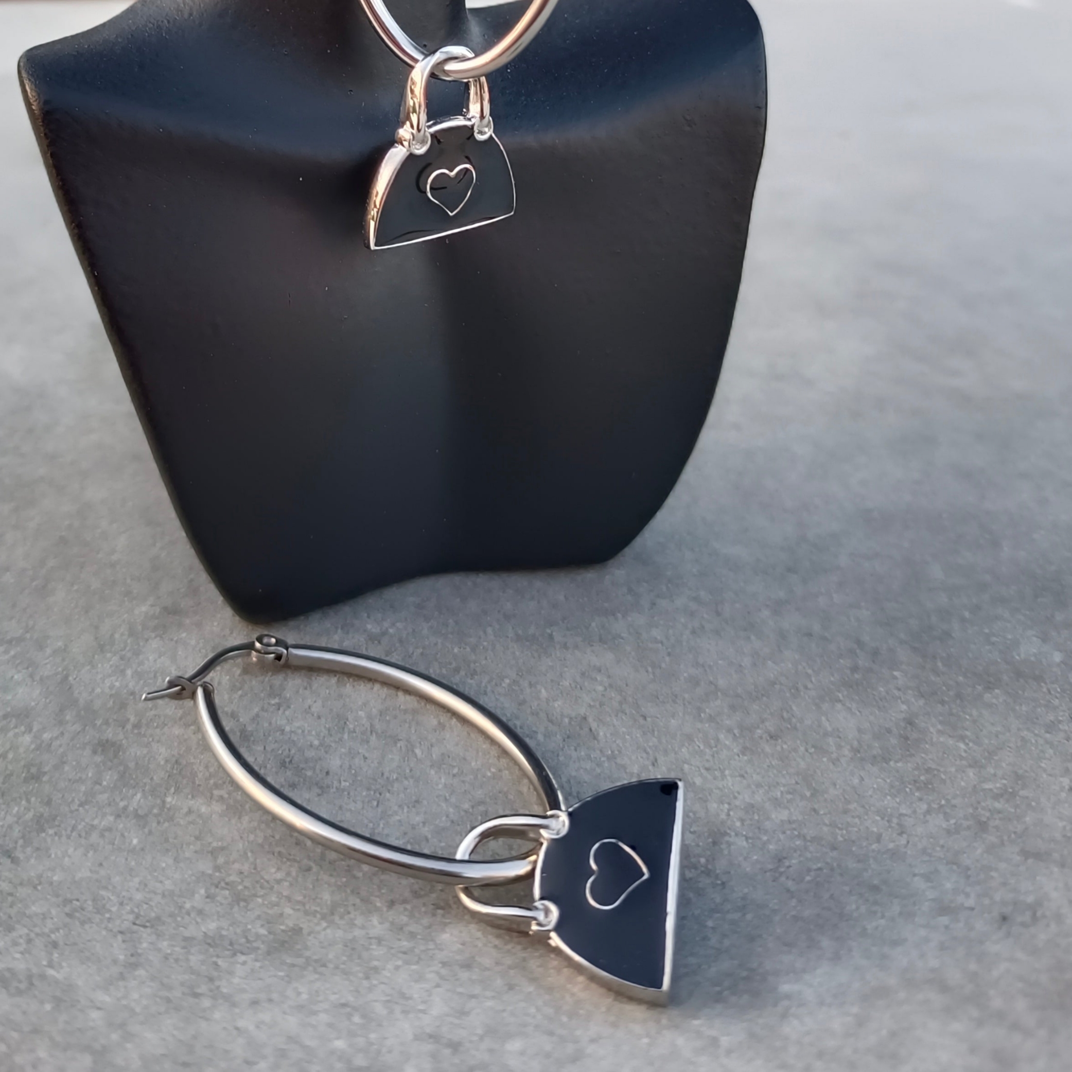 DĂ©couvrez nos superbes crĂ©oles NICOLE en acier inoxydable argentĂ©, faites Ă la main avec un pendentif en forme de sac Ă main ornĂ© de sequins noirs. Ces boucles d’oreilles Ă©lĂ©gantes apporteront une touche de sophistication Ă toutes vos tenues. Faites-vous plaisir avec un accessoire Ă la fois chic et unique.