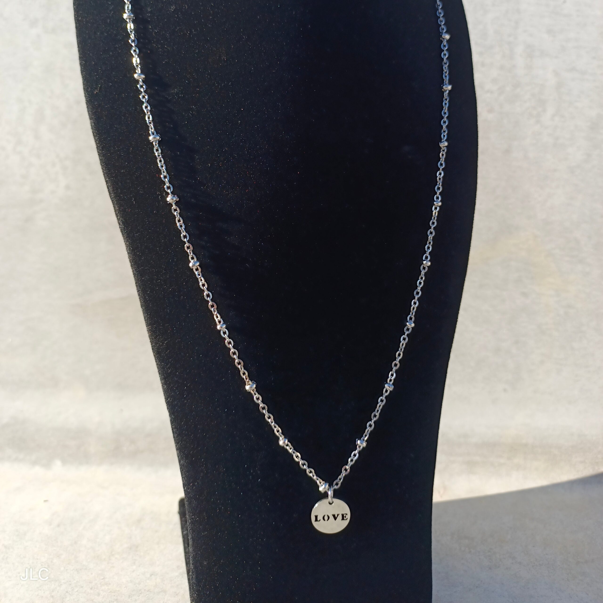 Ce collier est un bijou fait main, délicat et élégant. Il est composé d’une chaîne en acier inoxydable argenté ornée d’un pendentif rond gravé du mot “LOVE”. Ce collier évoque une sensation de glamour, de raffinement et de romantisme, faisant de lui un choix idéal pour un cadeau. Le fond flou met en avant le collier, attirant l’attention sur ses détails fins et sa conception soignée.