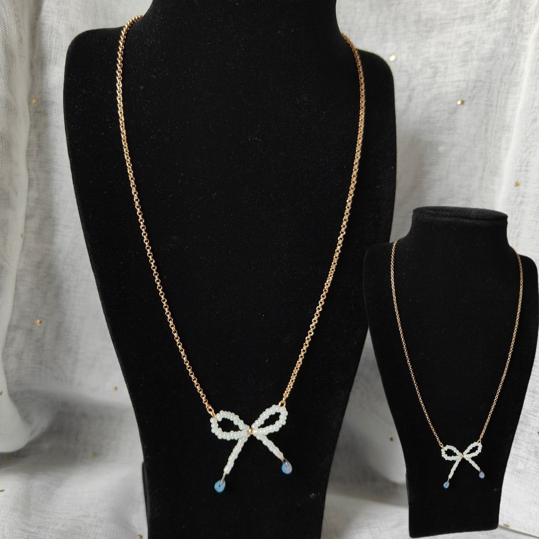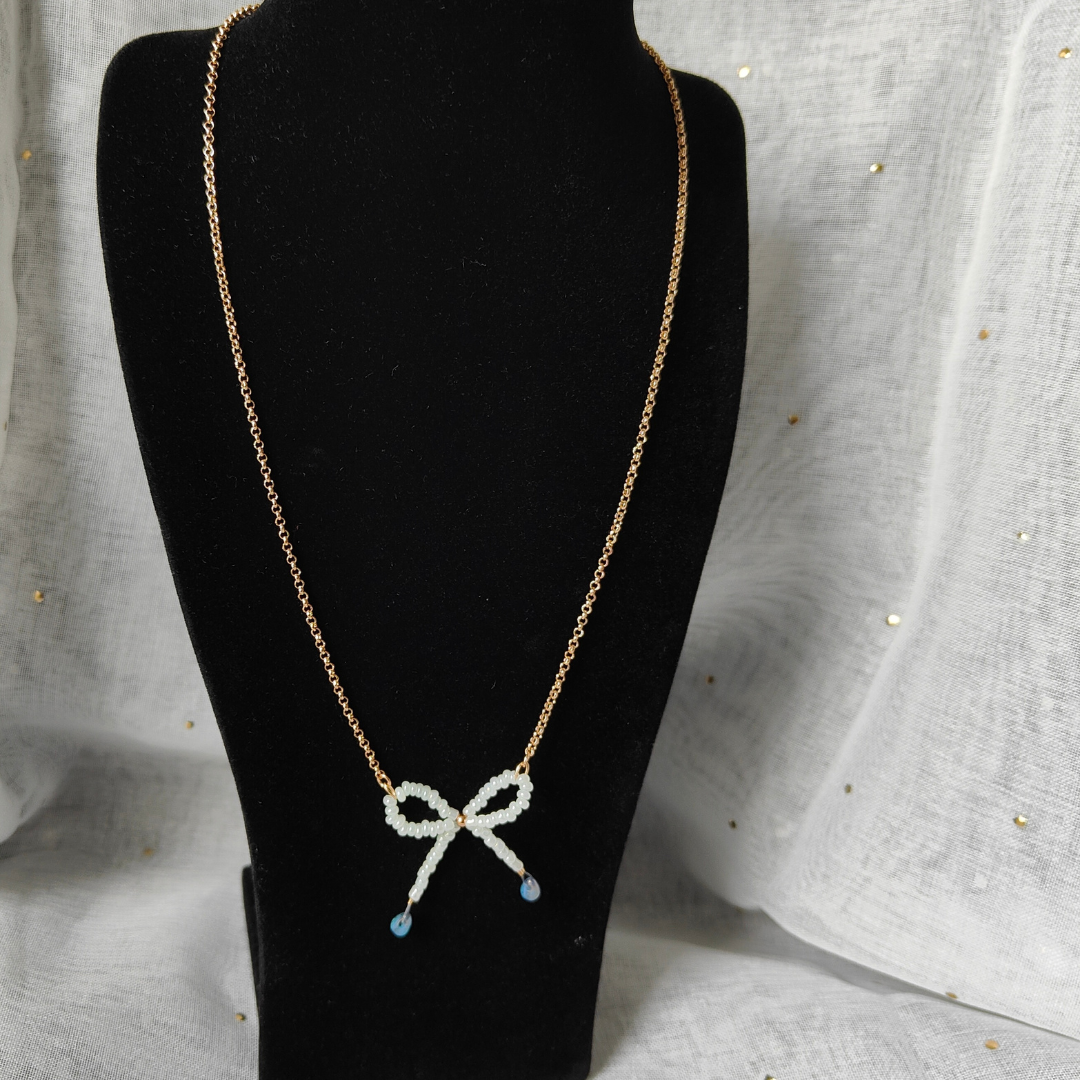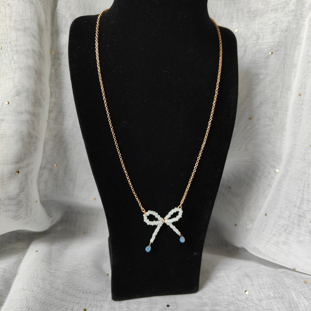 Le collier NOÉMIE est une pièce unique, faite main, alliant l’acier inoxydable doré et des perles exotiques en pendentif avec un motif nœud. Son design fin et raffiné apporte une touche de chic et d’élégance à votre tenue.